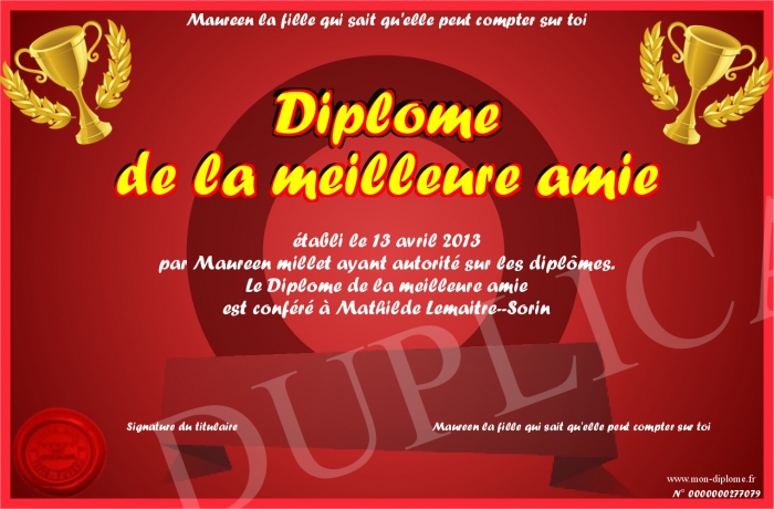 Envoyez par email votre Diplôme de la meilleure amie personalisé