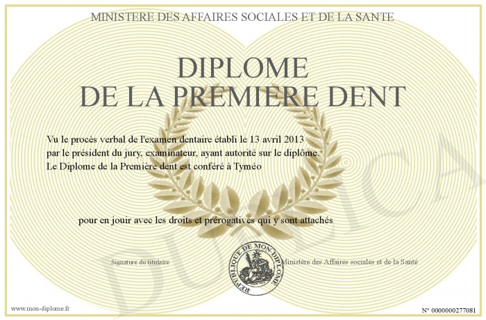 Envoyez par email votre Diplôme de la Première dent personalisé