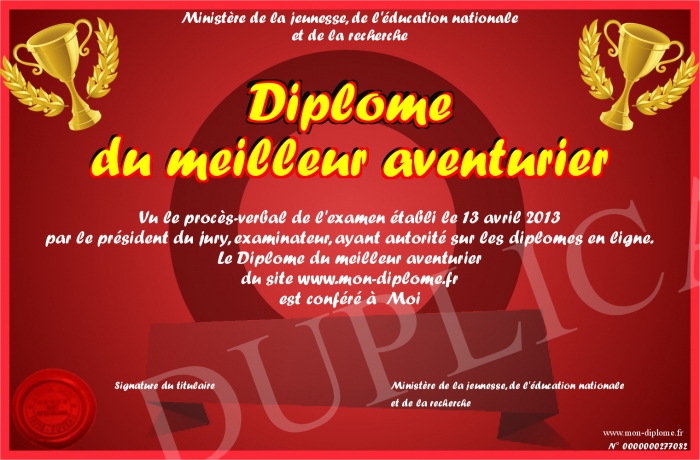 Envoyez par email votre Diplôme du meilleur aventurier personalisé