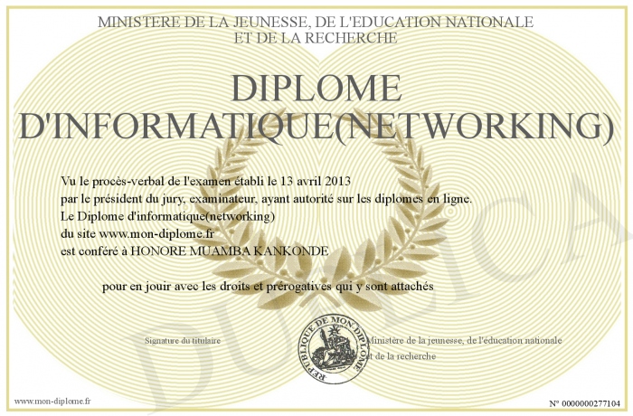 Envoyez par email votre Diplôme d'informatique(networking) personalisé