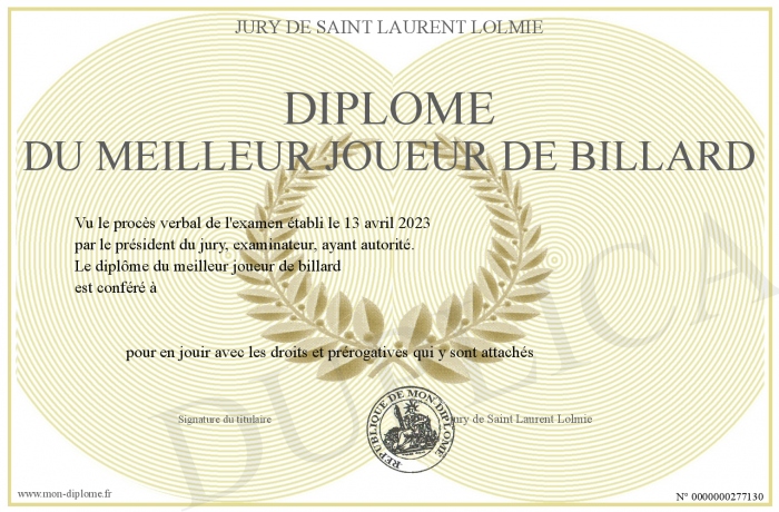 Envoyez par email votre Diplôme du meilleur joueur de billard personalisé