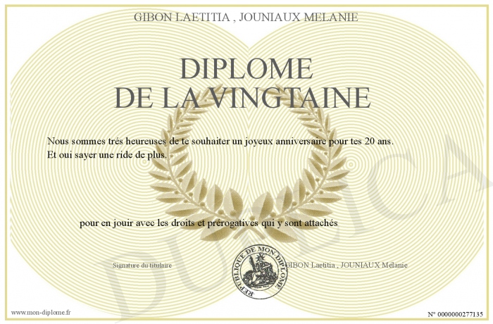 Envoyez par email votre DIPLOME DE LA VINGTAINE personalisé