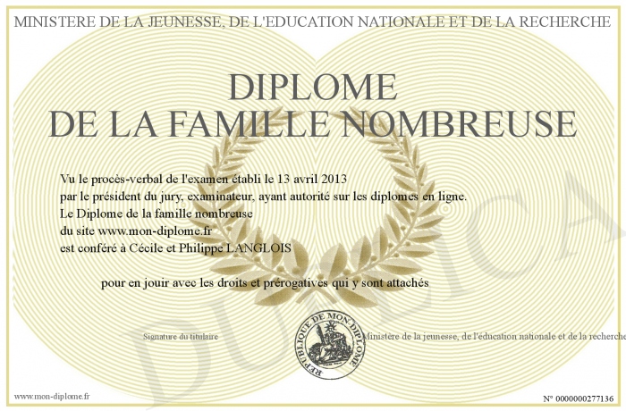Envoyez par email votre Diplôme de la famille nombreuse personalisé