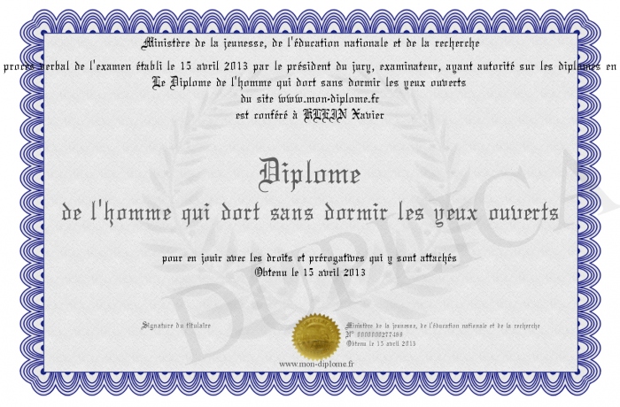 Envoyez par email votre Diplôme de l'homme qui dort sans dormir les yeux ouverts personalisé