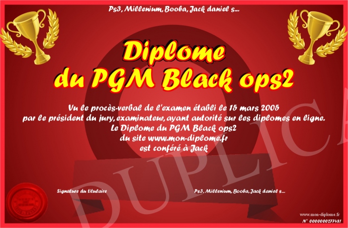 Envoyez par email votre Diplôme du PGM Black ops2 personalisé
