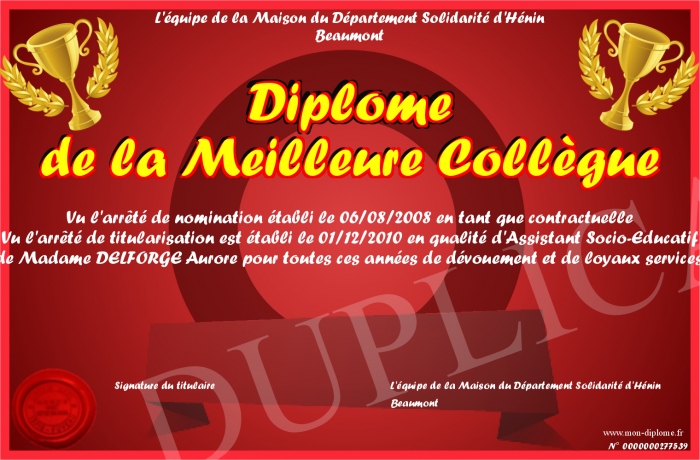 Envoyez par email votre Diplôme de la Meilleure Collègue personalisé