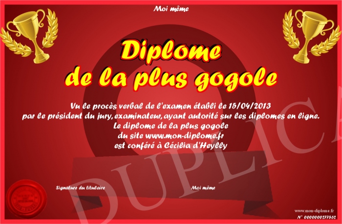 Envoyez par email votre Diplôme de la plus gogole personalisé