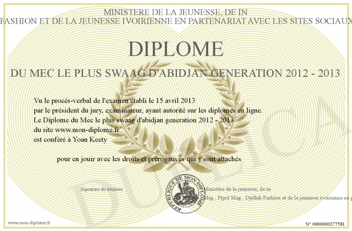 Envoyez par email votre Diplôme du Mec le plus swaag d'abidjan generation 2012 - 2013 personalisé