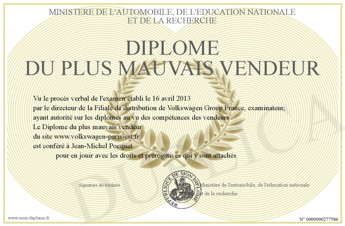 Envoyez par email votre Diplôme du plus mauvais vendeur personalisé