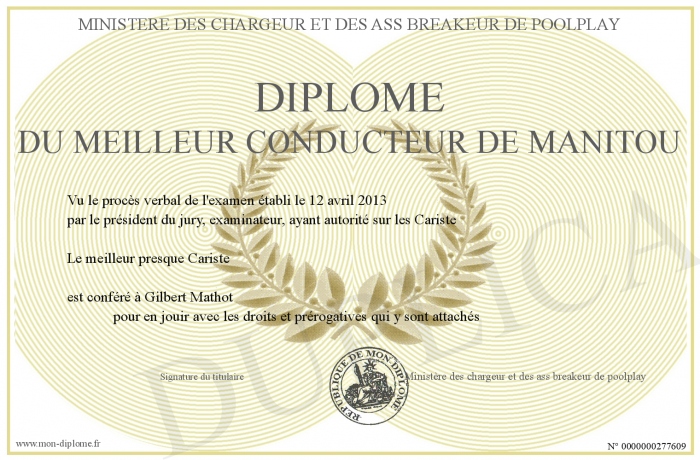 Envoyez par email votre Diplôme du Meilleur Conducteur de Manitou personalisé