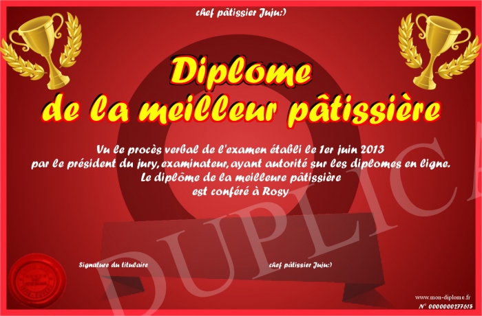 Envoyez par email votre Diplôme de la meilleur pâtissière personalisé