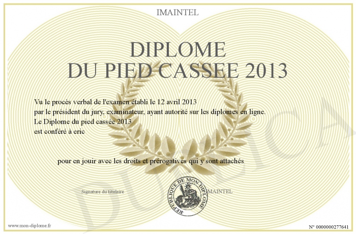 Envoyez par email votre Diplôme du pied cassée 2013 personalisé