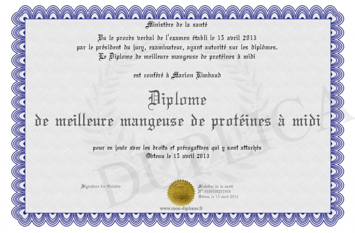Envoyez par email votre Diplôme de meilleure mangeuse de protéines à midi personalisé
