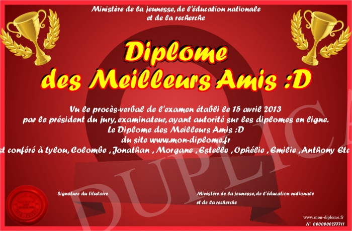 Envoyez par email votre Diplôme des Meilleurs Amis :D personalisé