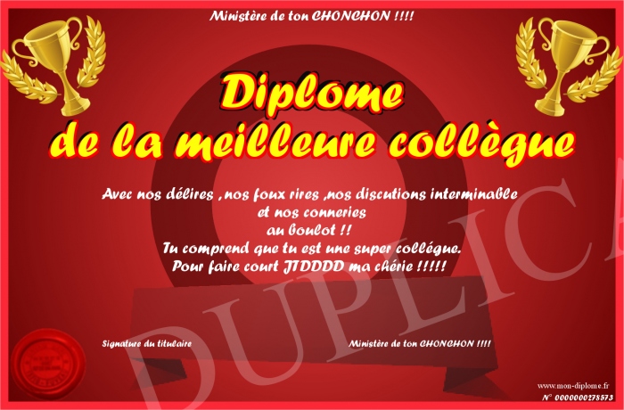 Envoyez par email votre Diplome de la meilleure collègue personalisé
