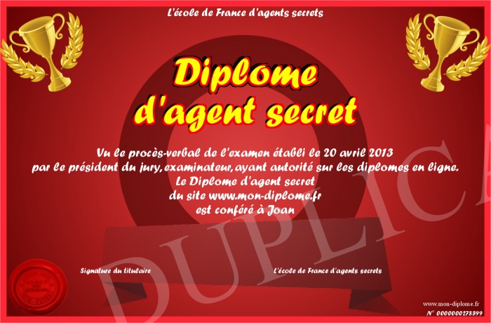 Envoyez par email votre Diplôme d'agent secret personalisé