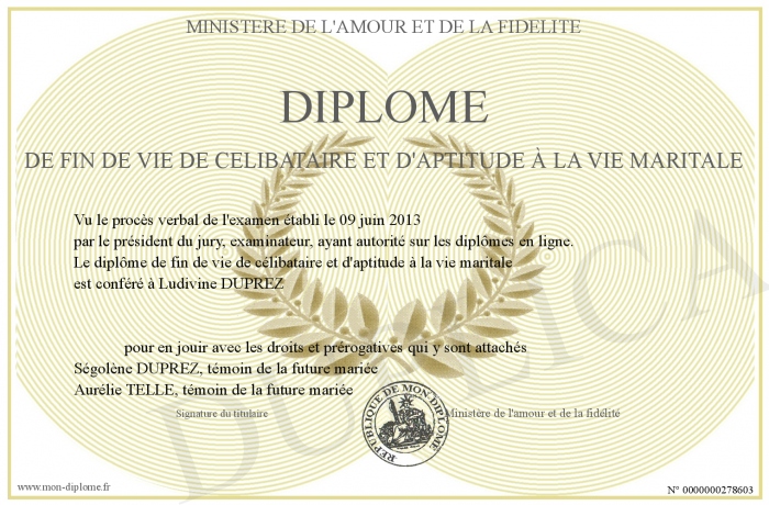 Envoyez par email votre Diplôme de fin de vie de célibataire et d'aptitude À la vie maritale personalisé