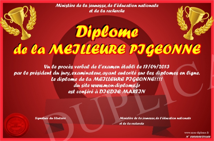 Envoyez par email votre Diplôme de la MEILLEURE PIGEONNE personalisé