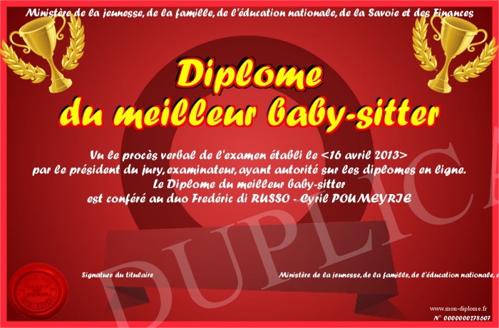 Envoyez par email votre Diplôme du meilleur baby-sitter personalisé