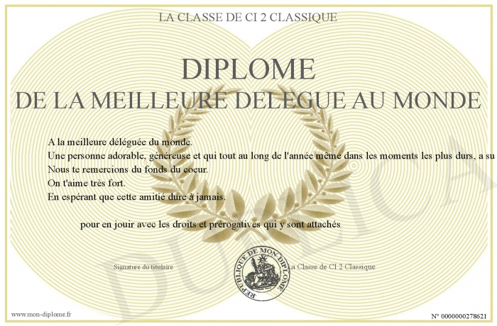 Envoyez par email votre Diplôme de la Meilleure Délégué au Monde personalisé