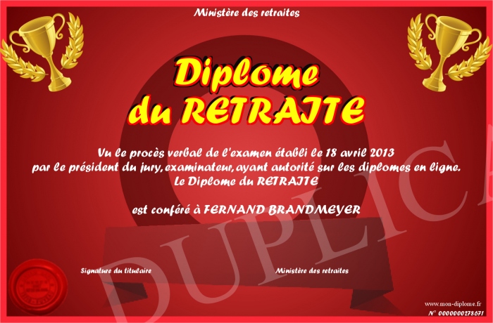 Envoyez par email votre Diplôme du RETRAITE personalisé