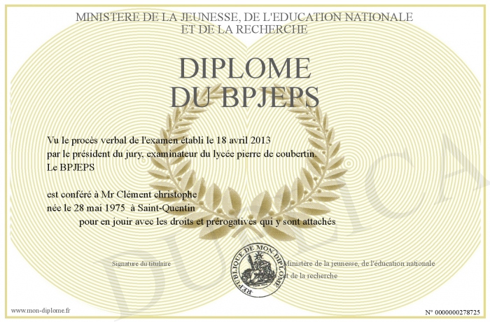 Envoyez par email votre Diplôme du BPJEPS personalisé