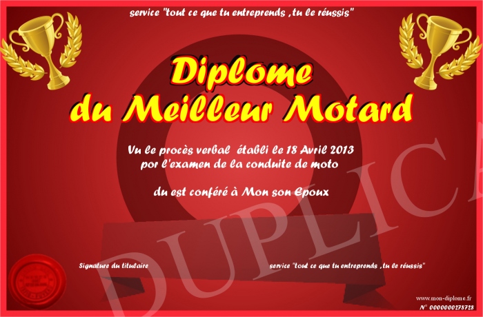 Envoyez par email votre Diplôme du Meilleur Motard personalisé