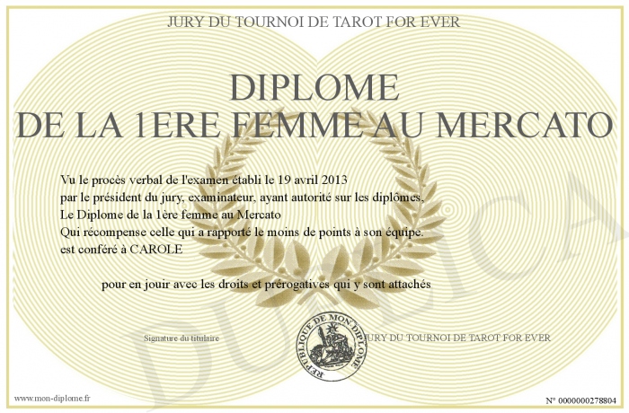 Envoyez par email votre Diplôme de la 1ère femme au Mercato personalisé