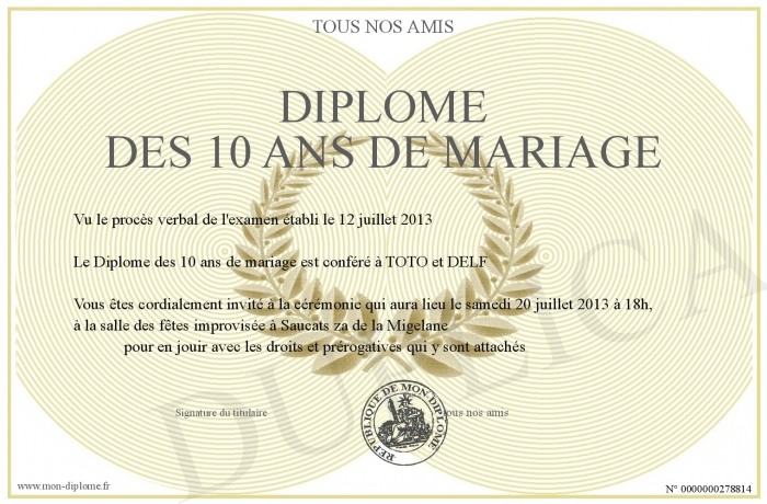 Envoyez par email votre Diplôme des 10 ans de mariage personalisé