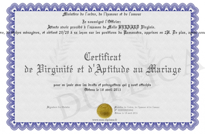 Envoyez par email votre Certificat de Virginité et d'Aptitude au Mariage personalisé