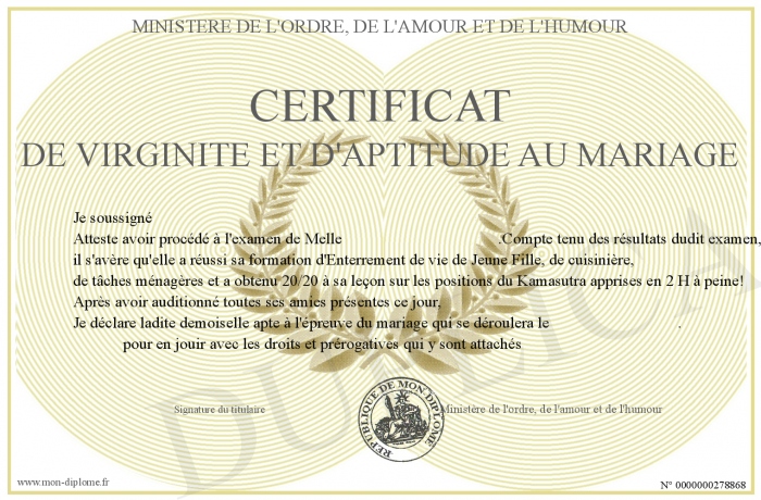 Envoyez par email votre Certificat de Virginité et d'Aptitude au Mariage personalisé