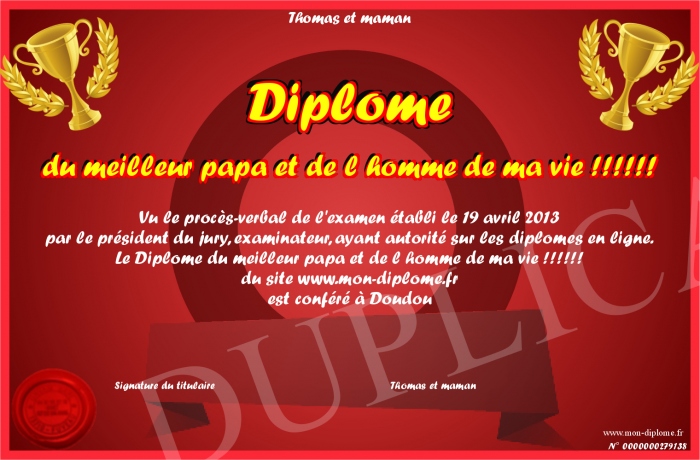 Envoyez par email votre Diplôme du meilleur papa et de l homme de ma vie !!!!!! personalisé