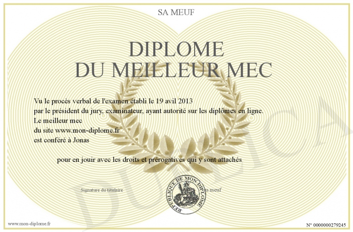 Envoyez par email votre Diplôme du meilleur mec personalisé