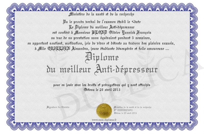 Envoyez par email votre Diplôme du meilleur Anti-dépresseur personalisé