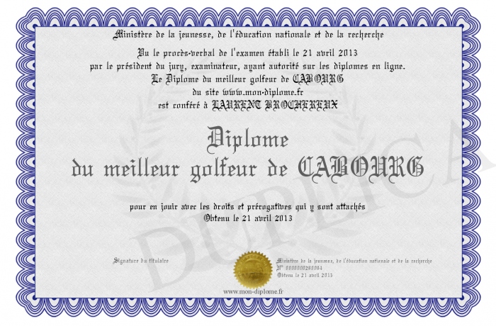 Envoyez par email votre Diplôme du meilleur golfeur de CABOURG personalisé