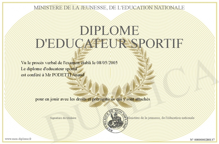 Envoyez par email votre Diplôme d'educateur sportif personalisé