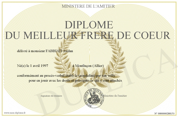 Envoyez par email votre Diplôme du meilleur frère de coeur personalisé
