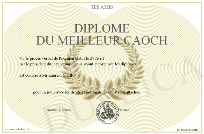 Envoyez par email votre Diplôme du meilleur caoch personalisé