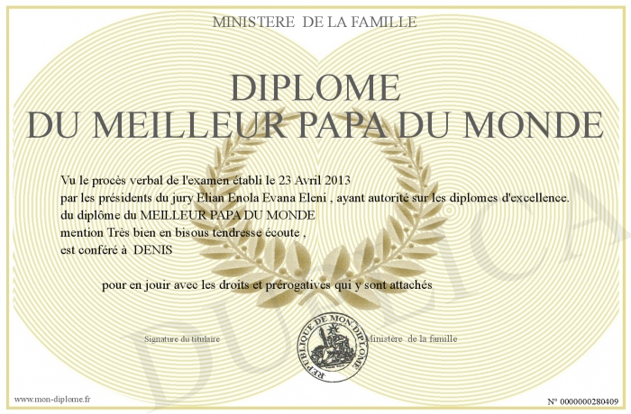 Envoyez par email votre Diplôme du meilleur papa du monde personalisé