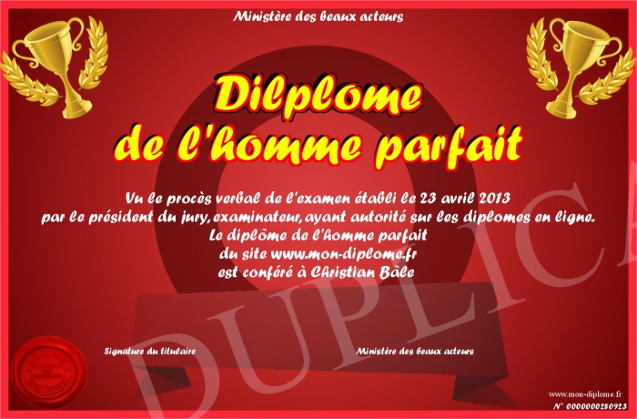 Envoyez par email votre Dilplome de l'homme parfait personalisé