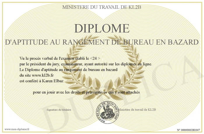 Envoyez par email votre Diplôme d'aptitude au rangement de bureau en bazard personalisé