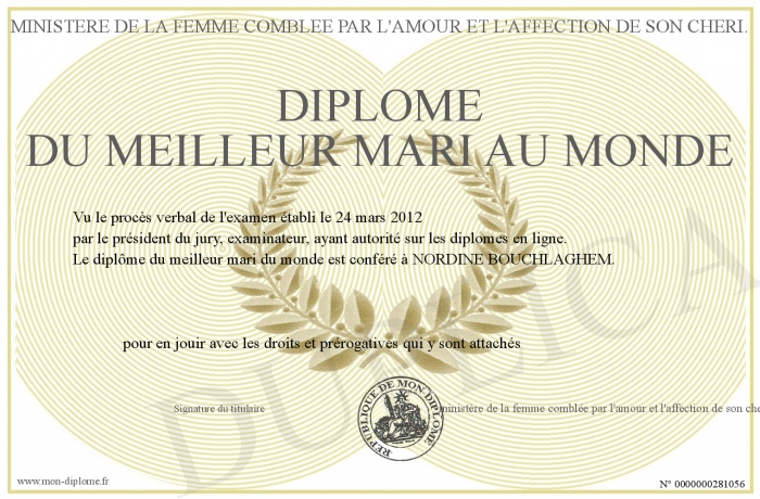 Envoyez par email votre Diplôme du MEILLEUR MARI AU MONDE personalisé
