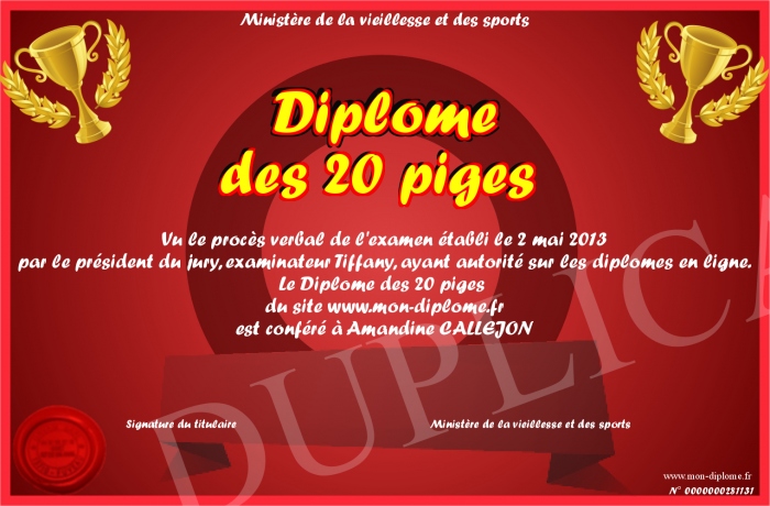 Envoyez par email votre Diplôme des 20 piges personalisé