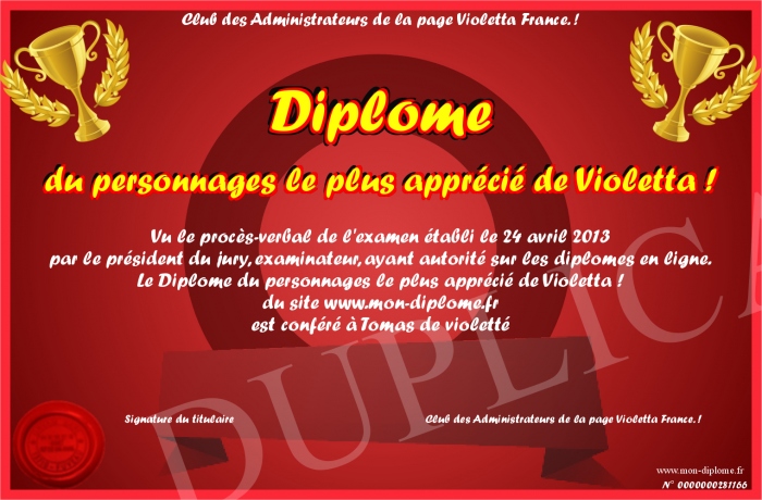 Envoyez par email votre Diplôme du personnages le plus apprécié de Violetta ! personalisé