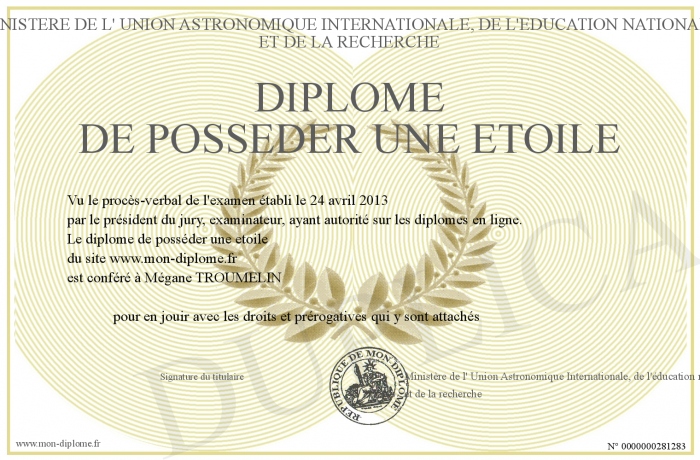 Envoyez par email votre diplome de posséder une etoile personalisé