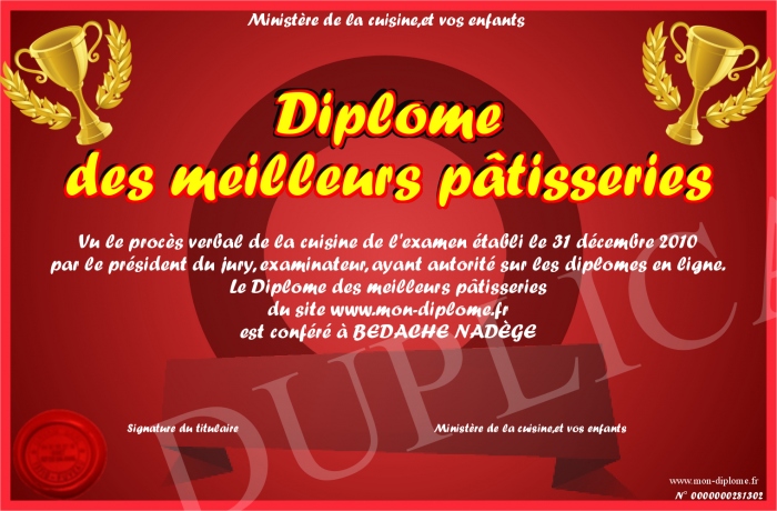Envoyez par email votre Diplôme des meilleurs pâtisseries personalisé