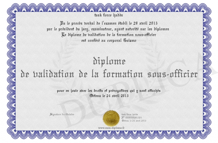 Envoyez par email votre diplome de validation de la formation sous-officier personalisé