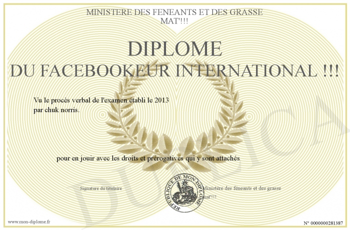 Envoyez par email votre Diplôme du facebookeur international !!! personalisé