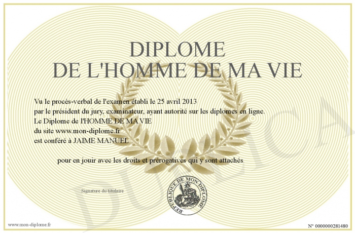 Envoyez par email votre Diplôme de l'HOMME DE MA VIE personalisé