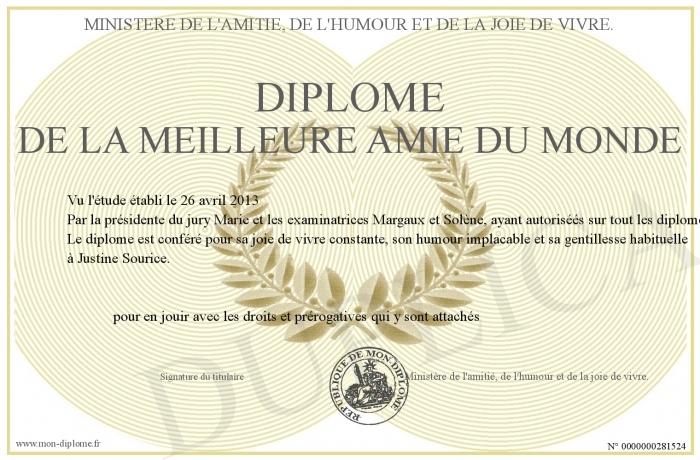 Envoyez par email votre Diplôme de la meilleure amie du monde personalisé